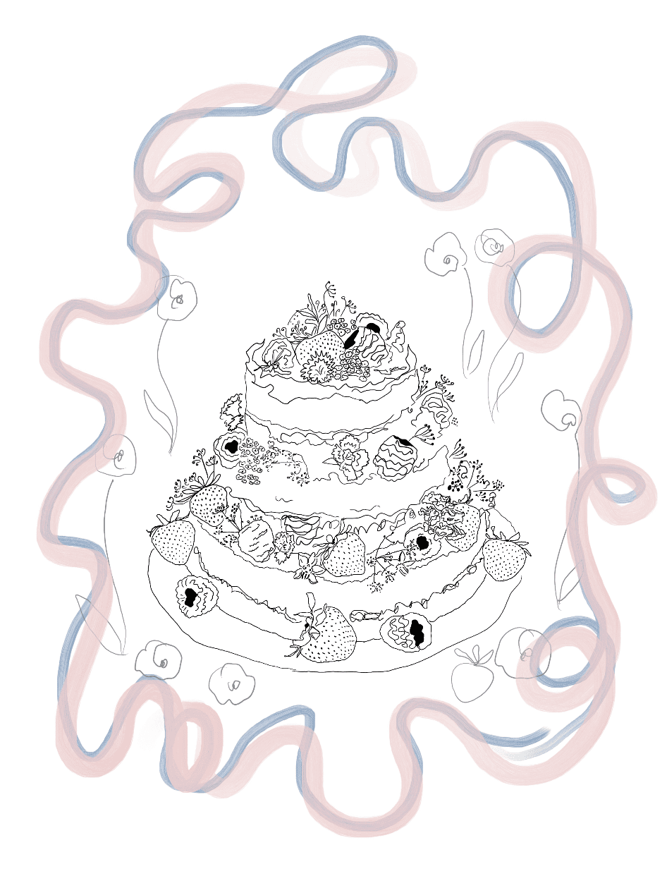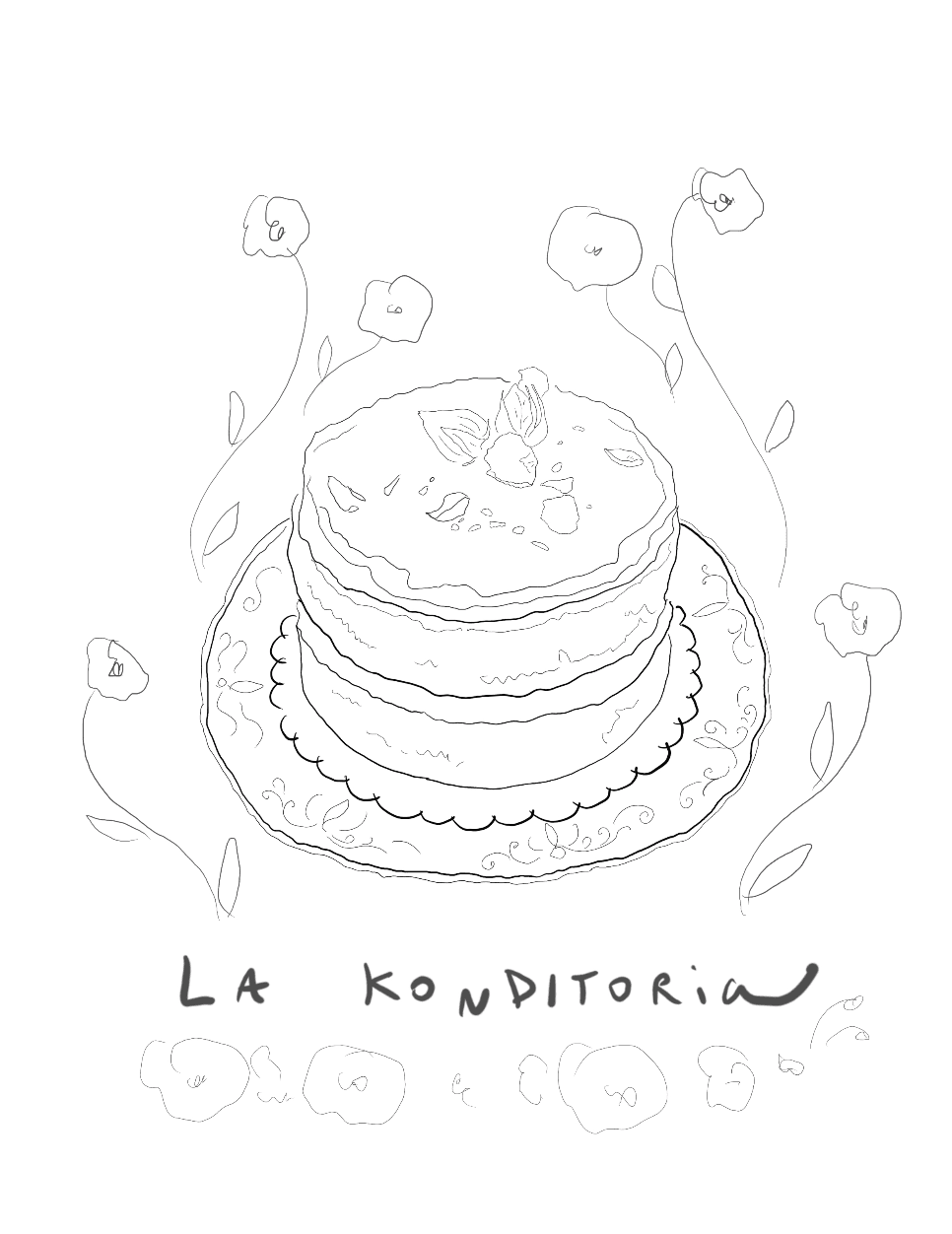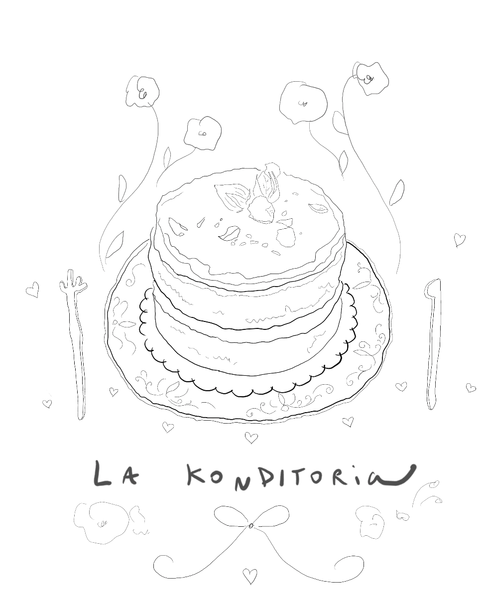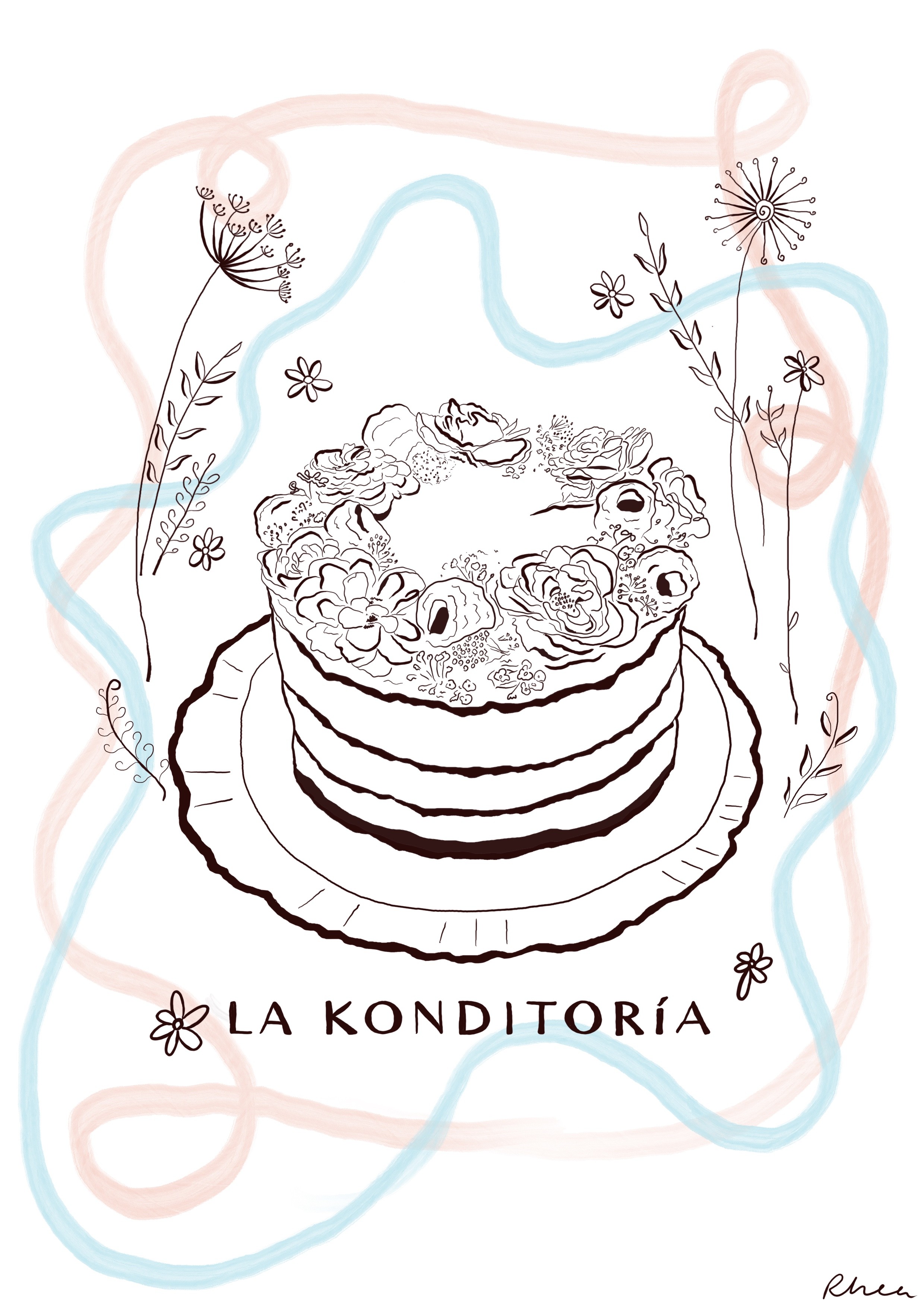 A cute postcard illustration I created for La Konditoría, a beautiful Bakery based in Barcelona. Deep cherry coloured line drawing which celebrate the delicate details of their bespoke made to order cakes. The brief from the client, was to have a little postcard of artwork given to her clients, upon a bakery order, mixing two art forms.